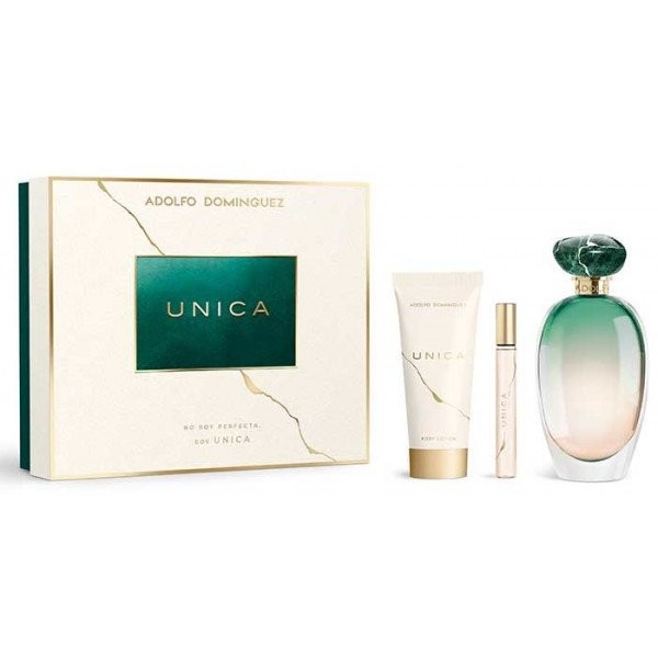 NO SOY PERFECTA, SOY ÚNICA ÚNICA de Adolfo Domínguez es un Eau de Toilette femenino que pertenece a la familia olfativa Floral Amaderada. Se lanzó en 2017 y quiere retratar una dimensión diferente de la feminidad. Se inspira en un nuevo patrón de feminidad, mucho más diversa, sin complejos, que revindica la valentía de asumir que la perfección no existe y que debemos aceptar que cada mujer es singular, excepcional y única. COMPOSICIÓN OLFATIVA. Con notas poco habituales consigue crear un aroma fresco y distinto muy característico. En la salida encontramos notas de hoja de shiso, anís estrellado y pimienta rosa. En el corazón aparecen notas florales de jazmín sambac, peonía púrpura y pachulí. Todo descansa sobre un goloso fondo de praliné, madera de cedro y musk. EL FRASCO. El frasco interpreta la belleza de la imperfección, por un lado, cuenta con formas sofisticadas y orgánicas en el vidrio y por otro, cuenta con un tapón-piedra decorado con la técnica de Kintsugi. Este arte japonés defiende la belleza de arreglar las fracturas de la cerámica con barniz de polvo de oro. LA PERFECCIÓN NO EXISTE. Se ha creado hasta un manifiesto para defender a la mujer actual que no busca el ideal de perfección sino que sabe que hay algo mucho mejor: ser una misma. Estuche UNICA de Adolfo Domínguez Edt 100 ml + Regalo Body Milk + Miniatura